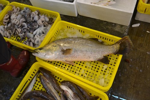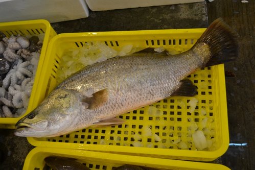 野生金目鱸為近海作業的漁船以刺網或釣具捕獲,撈上船就立即用冰海水處理保鮮,所以運送到市場時是僵直狀態的魚體。